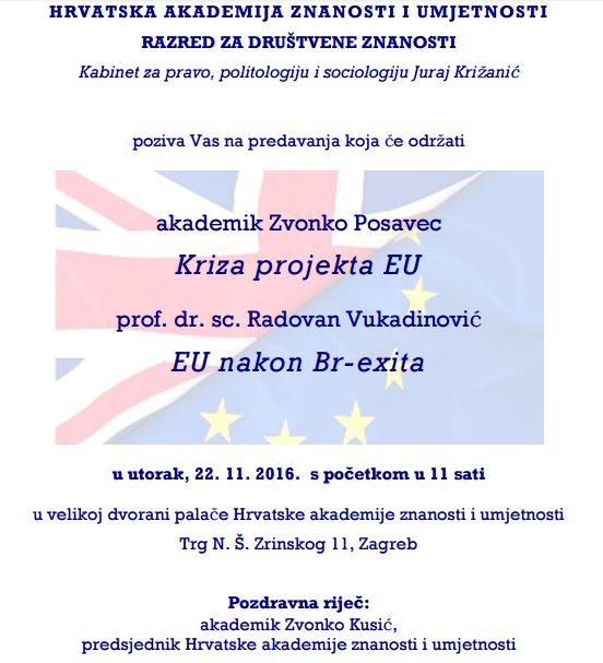 Pozivamo vas na predavanja koja će održati akademik Zvonko Posavec – KRIZA PROJEKTA EU i prof. dr. sc. Radovan Vukadinović – EU NAKON BREXITA, u